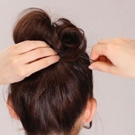马尾辫沿着发根缠绕成蓬松丸子头,至发尾用黑色小发夹扎好,这样才不会掉下来,看起来轻松自然,美感潇洒。