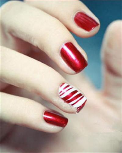 这款酒红色美甲并非纯色的单调,而是加入了一些可爱的元素,与蝴蝶结、丝带、雪花等等,作为冬日美甲,非常有感觉。红与黑的搭配,一直都没应为用色大胆,别有一种感觉,这款酒红色美甲就是如此,黑色的条纹,让整个美甲多了一种特别