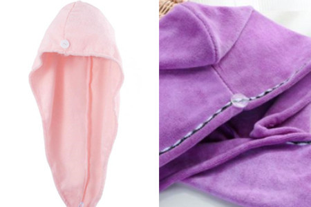 第二种的话,其实也更方便些,但更牢固些。现在市面上其实有这种毛巾的,可以把头发包住,然后的话在前面弄好之后,绕到后面就可以系起来,或者会有一些扣子或按钮,就很方便地把头发包起来了。从图片中可以比较清晰地看出来毛巾是有按钮的,所以这是比较容易把头发包起来的,其实这种方法要学到,需要一条这样的毛巾就好了。