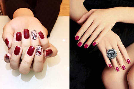 做美甲使用的指甲油要专门的甲油胶,这个烤干了以后才不容易掉色。甲油胶一般要涂两层,根据上色的情况来决定到底涂几层。像过年这种的气氛比较热闹,那么我们就可以涂艳丽一点的红色。一些简单的花纹如果自己想做的话也是可以的。