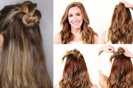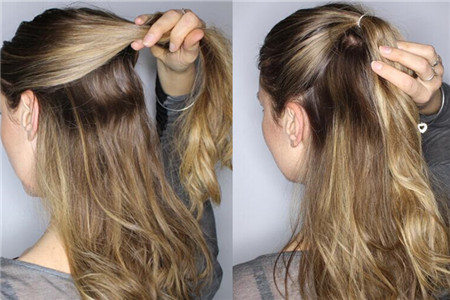 接下来再使用一个皮筋,将这个马尾扎成一个半丸子的状态,留出马尾多余部分的头发。再将这个多余部分的头发顺时针的向上盘绕,用皮筋固定住,这款卷发无刘海的半丸子头就简单的搞定了!比较钟爱这款造型的美眉们,可以尝试下。