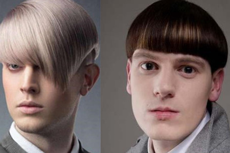 女生要是圆脸的话较可爱,而男生是圆脸的话就叫呆萌了。但是很多男生并不喜欢走呆萌路线,反而更喜欢走酷酷的路线。对于这类男生,可以选择上图左边这款几何造型的发型,它的特点就是其几何型的发型轮廓正好可以与男生圆脸的脸型轮廓像搭配,从而在视觉上起到修饰脸型的作用。