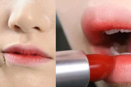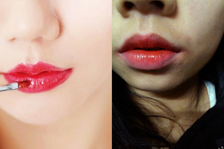 想拥有一款精致而又吸引人的咬唇妆,就要细心地去打造它。简单咬唇妆的打造方法也是比较简单的,首先我们需要像上图左边所示的这样利用粉底或者bb霜在嘴唇上面涂上薄薄的一层打底,当然,在此步骤之前,我们还是要先用润唇膏润润嘴唇,以免干裂。之后便可以利用我们喜欢的口红颜色来进行嘴唇内侧的填涂了。