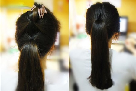 2.将下面的马尾穿进上面的马尾里面,这样,无论我们怎么甩头发,马尾都会一直高高耸立。