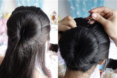 2.大家把马尾全部裹进拉发针的大圆环中,并将拉发针顺势下拉,这样,花苞头的初步形态就有了。这时,我们再把拉发针的尾巴翻转过来并插进头发里,漂亮的韩式低花苞头就盘好了。