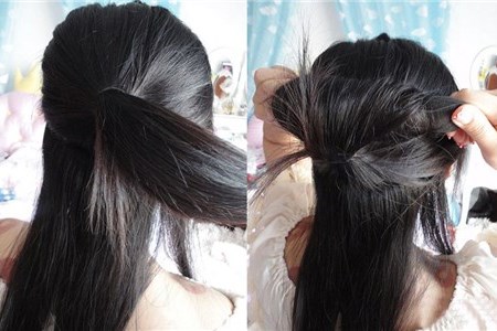 1.由于盘发器的尺寸有限,因此我们要先把头发分成两半,并把上面那半用皮筋扎成一个马尾。