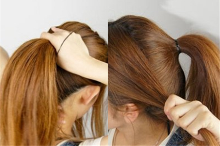 我们将留下来的两股头发向着中心的马尾靠拢,先将左边的顺时针方向绕在马尾上,然后将右边的那一股头发也放在马尾上,这样便是起到了增加马尾的高度,当然这是只有高马尾才会这样的,这个步骤很简单的。