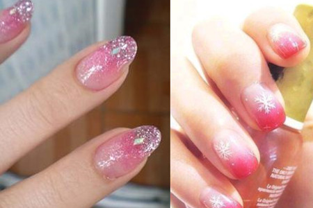 还有一类粉色渐变指甲是上图所示的这两款,也就是带有细小亮片的粉色指甲,一些留了长指甲的女生可以参考左边这款带有亮片的粉色渐变指甲,相信打造这样的一款美甲可以让你的纤纤玉手更加精美。一些指甲较短的女生则更加适合右边这款带有雪花图案的粉色渐变指甲。这款指甲的雪花图案设计得十分精美。