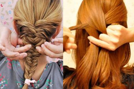 3.然后将左边的一小股头发放到右边头发里去,再将右边的一小股头发放到左边头发里去。