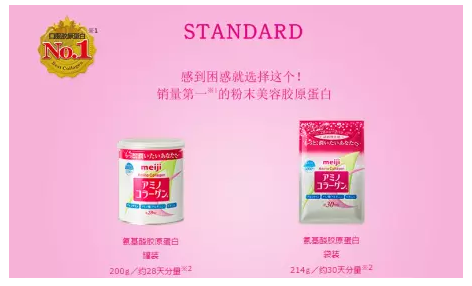 在日本销量第一的明治氨基酸胶原蛋白粉末被誉为“最受世界注目的氨基酸胶原蛋白”。分为几个不同系列的产品,第一款是STANDARD:销量第一的粉末美容胶原蛋白。里面蕴含着鱼胶原蛋白肽、氨基酸、维他命C、氨基葡萄糖、等多种成分。