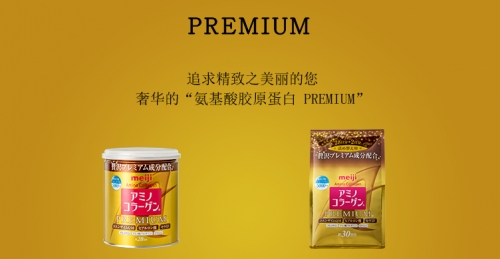 第二个系列为金装标识的奢华“明治氨基酸胶原蛋白PREMIUM”,不仅拥有上述STANDARD富含的成分,同时还富有吸附水分并防止水分蒸发的“神经酰胺”,只要用1g就可以锁住6L水分的“玻尿酸”以及让身体健康的源泉“辅酶Q10”成分。
