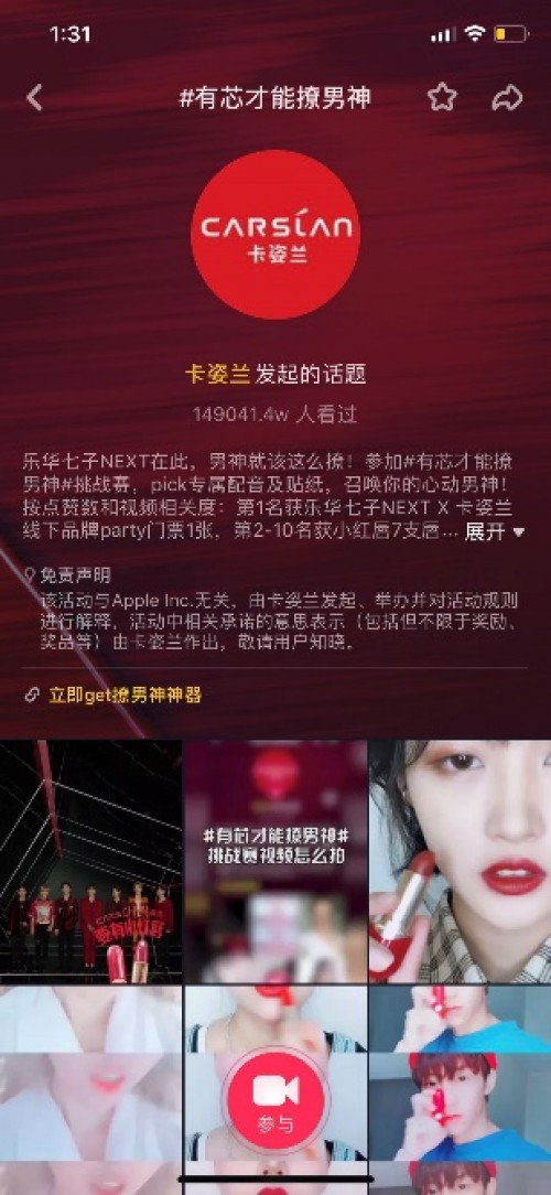 不断释放“小红唇”的潮流影响力,创意话题X互动方式与年轻消费者碰撞火花。借助抖音社交平台发起#有芯才能撩男神#抖音挑战赛,引发全民主动参与红唇热潮,主动创造和带动“小红唇”时尚文化。抖音挑战赛上线的第3天,便引起25W +用户参与,观看量破10亿+,占领抖音彩妆行业挑战赛排行首位。而#要有小红唇#的微博话题热度已达3.3亿,冲上热门话题榜单TOP2。