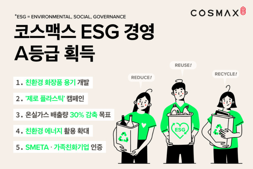 近日,负责韩国企业年度ESG(EnvironmentalSocialGovernance)经营情况评审工作的韩国企业支配结构院(KCGS)公布了2021年度韩企ESG经营情况评审结果,其中韩国COSMAX被评定为A级,为韩国国内首家获评ESG经营综合评价A级的化妆品ODM企业。对比2020年的B+等级,韩国COSMAX可谓是百尺竿头,更进一步。细分来看,各个分类项目在2021年也各有精进,获得△环境类A级△社会类A级△治理类B+级等各分类评审的优异成绩。