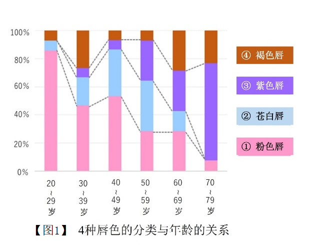 花王妆容研究所在第17届日本感性工学会春季大会※上发表的研究结果指出,日本女性的唇色可分成粉色、苍白、紫色、褐色4类组群。从唇色组群比例来看,褐色以外的唇色会随着年龄的变化而改变。