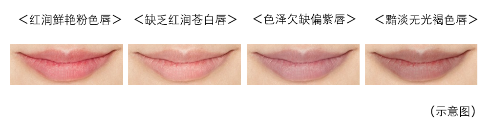 为了能更深入了解唇色,花王妆容研究所对年龄在21~79岁之间的85名日本女性的唇色进行了分类,发现原生的唇色按照“红润鲜艳”、“缺乏红润”、“色泽欠缺”、“暗沉”等特征可分成4个组群,各组群相应地称之为“粉色唇”、“苍白唇”、“紫色唇”、“褐色唇”。