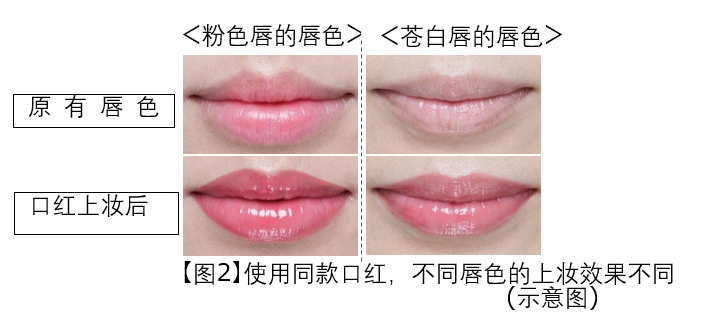 即使是同款颜色的口红,不同的人上妆后色泽感觉也可能不同,这是由于口红的发色会受到原本唇色的影响。(图2)。